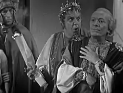 ![]() Nero (Derek Francis) reprimands the Doctor (William Hartnell) for setting fire to his plans. The performances of Francis and Hartnell in the serial received praise. | |||