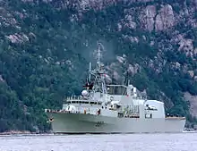 HMCS Fredericton, a Department of National Defence frigate, followed the RCMP vessel at a distance and provided necessary assistance throughout the journey, ensuring the safety of the police officers and serving as command post.