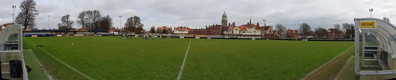 The Larkins Field End, where the clubhouse stands, was originally a wooden grandstand structure, built in the 1930s when attendances at the town club were increasing. The Town Hall side, now known as the East Terrace was asphalted at the same time. The wooden grandstand was destroyed by an arson attack in 1969. The stand was rebuilt but lost its roof in the 1987 hurricane.[2] The current stand today, known as the Taffy Jones/Sid Mayall stand was built in 1994, 25 years after the original grandstand was destroyed.