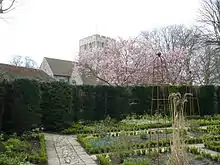 Three sets of French windows from the dining room lead out of the east front to a garden terrace, with stone steps down to a rectangular garden to the east which has wide mixed borders containing herbaceous plants and shrubs. The garden was probably also originally designed by Lutyens, but inspired by his collaborations with Gertrude Jekyll (no record remains of her direct involvement). A further triangular area of the garden lies the south, with yew hedges and roses. The 3.7 acres (1.5 ha) gardens also include a kitchen garden and tropical garden, an informal water garden to the north with "Lake Patricia" installed in the 1960s, extensive collections of dahlias and echinops, a jungle garden, and an avenue of holm oaks.