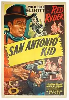 The San Antonio Kid is a 1944 American Western film directed by Howard Bretherton starring Wild Bill Elliott in the role of Red Ryder.[1] It was the fourth of twenty-three Red Ryder feature films that would be produced by Republic Pictures and the first shot without George "Gabby" Hayes who had starred with Elliott since he relocated to Republic Pictures.[2] The picture was shot on the studio’s back lot along with outdoor locations at Iverson Ranch, 1 Iverson Lane, Chatsworth, Los Angeles, CA, USA.[3]