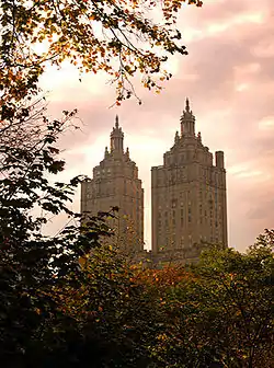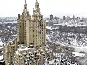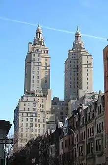 The San Remo is a luxury 27-floor co-operative apartment building at 145 Central Park West, between West 74th and 75th Streets, on the Upper West Side of Manhattan in New York City. Opened in 1930, the San Remo is described by Glen Justice of the New York Times as "a dazzling two-tower building with captivating views of Central Park."[1][3] As a housing cooperative, its board has a reputation for "lenient admissions standards" compared to the conservative, old-money boards on the other side of the park.[4]