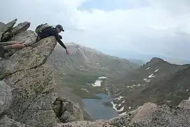 ![]() A climber leaning on an overhang that's part of the sawtooth. Behind him, to the left, is Mount Evans, and Mount Bierstadt is to the right, off screen. Abyss Lake can be seen below. | |