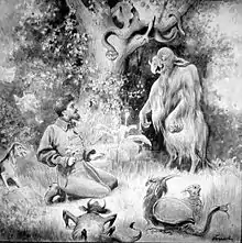 In a letter to his son of November 23, 1856 Aksakov wrote: "I am writing a story which in my childhood I knew by heart".[4] Aksakov had been told that story as a child. He recalled that he was ill and suffered from insomnia. Then a housekeeper named Pelagia, who was well known for telling great fairy tales, sat by the stove and began to tell him the story of Scarlet Flower. Aksakov added that he did not feel sleepy at all, on the contrary, couldn't fall asleep until the very end.[5] The Scarlet Flower was first published in 1858. It was printed as an appendix in Aksakov's Childhood Years of Grandson Bagrov (Detskie gody Bagrova-vnuka) "not to interrupt the story of childhood".[4][6]