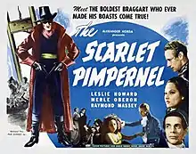 The Scarlet Pimpernel is a 1934 British adventure film directed by Harold Young and starring Leslie Howard, Merle Oberon, and Raymond Massey. Based on the 1905 play by Baroness Orczy and Montagu Barstow and the classic 1905 adventure novel by Orczy, the film is about an eighteenth-century English aristocrat (Howard) who leads a double life, passing himself off as an effete aristocrat while engaged in a secret effort to rescue French nobles from Robespierre's Reign of Terror. The film was produced by Alexander Korda. Howard's portrayal of the title character is often considered the definitive portrayal of the role.[1] In 1941, he played a similar role in "'Pimpernel' Smith" but this time set in pre-WWII Germany.