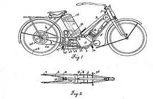 Scott designed and patented a vertical twin two-stroke engine in 1904,[4] and patented the familiar Scott motorcycle frame in 1908[5] designed to accept an engine of the type in the former patent and to achieve a low centre of gravity. The resulting motorcycle was launched in 1908 featuring a 450 cc two-stroke twin-cylinder water-cooled engine. Innovative features included a patented two-speed chain transmission[6] in which the alternative ratios were selected by clutches operated by a rocking foot pedal and a kick start also patented.[7] The first few machines to his design were produced by Bradford-based car firm Jowett in 1908 and soon after he set up as a manufacturer in his own right at the Mornington Works, Grosvenor Road, Bradford.[1]