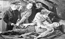 One of the most popular of Barrymore's films, this version extends the story beyond the final battle of man versus whale in a variation on Melville's book. Adding publicity to the film was a bit of early Hollywood hype, unintentional though it may seem: the actress Priscilla Bonner was fired by Barrymore from the role of Wiscasset, in preference for his lover, actress Dolores Costello, and Bonner successfully sued the studio and won a considerable out-of-court settlement.[4] Barrymore exploited the romantic scenes with Costello to their full potential in the film, displaying a "boyish enthusiasm" according to biographer Margot Peters, which made him fall out with Costello's mother. Barrymore drank heavily during the production of the film, and his eyes were constantly bloodshot, with stubble on his chin. Producer Jack L. Warner said "that's a great makeup job" to director Millard Webb, who retorted, "That's not makeup. It's a hangover".[5] The ship used in the film, The Narwhal, was actually a former fighting ship with decks stained with blood from fights.[6] The theme in the orchestral score is "Love's Old Sweet Song".[7]