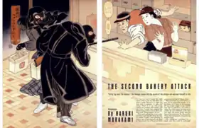 "The Second Bakery Attack" was originally published in the August 1985 issue of Marie Claire Japan.[2][3][4] As its title suggests, "The Second Bakery Attack" is a sequel to Murakami's short story "Bakery Attack", which was published in the October 1981 issue of Waseda Bungaku, the literary magazine of Murakami's alma mater Waseda University.[5] "The Second Bakery Attack" was included in a short story collection of the same name released by Bungeishunjū in April 1986.[6] The story was later translated into English by Jay Rubin and published in the January 1992 issue of Playboy.