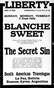 The Secret Sin is a surviving 1915 silent film drama produced by Jesse Lasky and distributed by Paramount Pictures. It was directed by Frank Reicher and starred Blanche Sweet, Thomas Meighan and Sessue Hayakawa. This film often thought lost actually survives at the Library of Congress and along with a few other surviving Lasky features from 1915-17 allows viewing of Blanche Sweet during her Paramount period immediately after she left D. W. Griffiths employ. In this film Sweet has a rare chance to act in a double exposure scene playing two different characters.[1][2][3]