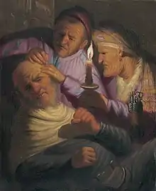 Stone Operation shows a man being operated on by a barber-surgeon watched by the latter's assistant.[2] This work is again in the Leiden Collection.[2] "Stone removal" operations were offered to patients as supposed cure for headaches.[2] Rembrandt is alluding to the Dutch idiom "cutting out a stone", meaning to fool someone.[2] It is possible that the model for the barber-surgeon was Rembrandt's father.[2]