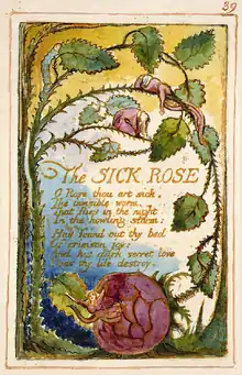 The Sick Rose is a poem by William Blake. The poem mentions through the symbols of the rose and the worm, how intense experience preys upon unpolluted innocence. The first publication was in 1794, when it was included in his collection titled Songs of Experience as the 39th plate. The incipit of the poem is O Rose thou art sick. Blake composed the page sometime after 1789, and presents it with the illuminated border and illustrations that were typical of his self publications. Most aspects of the original production were undertaken by the author; the composition of the poem and design, engraving, and promotion of the work. The printing was usually done by Blake's wife, Catherine, as well as any colouring not performed by Blake himself.[1]
