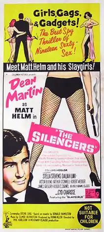 The Silencers is a 1966 American Pathécolor spy film spoof motion picture released in 1966 and starring Dean Martin as agent Matt Helm. It is loosely based upon and takes its title from the 1962 novel The Silencers by Donald Hamilton, and also adapts elements of Hamilton's first Helm novel, Death of a Citizen (1960).