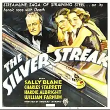 The Silver Streak is a 1934 film loosely based on the record-setting "dawn-to-dusk" run of the Pioneer Zephyr on May 26, 1934.[2] The original Zephyr trainset was used for the exterior shots in the film, while interior scenes were filmed on a sound stage in Hollywood. For the film, the "Burlington Route" nameplate on the train's nose was replaced with one that read "Silver Streak".