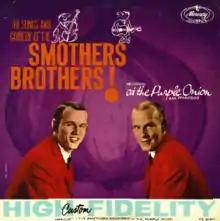 The Smothers Brothers at the Purple Onion, released May 1, 1961 on Mercury Records, is the first album released by the Smothers Brothers and established their reputation as folk music satirists. The Purple Onion was a celebrated comedy and music club in the North Beach area of San Francisco that also launched the careers of the Kingston Trio and Phyllis Diller, besides the Smothers Brothers. The album's full cover text is: The Songs and Comedy of the Smothers Brothers! Recorded at the Purple Onion, San Francisco, and is Mercury catalog number MG 20611 (monaural), and SR 60611 (stereo). It is sometimes referred to as Live at the Purple Onion.