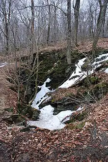 The Snow Hole is located in the Taconic Mountains, New York, USA along the ridge line between Bald Mountain and the White Rock (Taconic Mountains). It is a crevasse in which snow can be found well into the summer. The Snow Hole can be accessed by hiking the Taconic Crest Trail about 2.75 miles north from the Petersburgh Pass parking area just off of Route 2. The Snow Hole is located at 42°45.538′N 73°16.840′W. Finding the location of the Snow Hole can be confusing, as several maps (including Google maps and USGS Berlin quadrangle, 1:25,000 scale - 1988) mark the location of the Snow Hole summit at 42.743671°N 73.275118°W. However, that is a separate mountain summit and not the actual Snow Hole. The posted hiking map at the kiosk to the Taconic Crest Trail at Petersburgh Pass has the location correctly identified. Typically the crevasse has snow at the bottom of it year round.