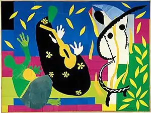 The Sorrows of the King is a collage using cut out paper shapes by Henri Matisse from 1952. It was made from paper he had coloured with gouache paint and is mounted on canvas. Its area is 292 x 386 cm. It was his final self-portrait.[1] During the early-to-mid-1940s Matisse was in poor health. By 1950 he stopped painting in favor of his paper cutouts. The Sorrows of the King is an example of Matisse's final body of works known as the cutouts.