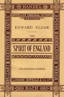 The Spirit of England, Op. 80, is a work for chorus, orchestra, and soprano/tenor soloist in three movements composed by Edward Elgar between 1915 and 1917, setting text from Laurence Binyon's 1914 anthology of poems The Winnowing Fan. The work acts as a requiem for the dead of World War I and is dedicated "to the memory of our glorious men, with a special thought for the Worcesters".[1]