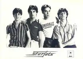 The band was formed in June 1976.[1] The Starjets consists of guitarist/vocalist Terry Sharpe, guitarist/vocalist Paul Bowen, bassist Sean Martin and drummer Liam L'Estrange.[1] The group sported a mix of punk and mainstream pop influences.[1] Early sets consisted of such 1960s pop standards as "Please Please Me" by The Beatles and "Sugar, Sugar" by The Archies.[1] They opened for groups as diverse as the Bay City Rollers and Stiff Little Fingers.