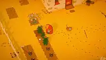 Stillness follows a Harvest Moon-esque gameplay style, where the player controls Talma, an elderly farmer who takes care of goats, chickens, and plants.[1] Unlike other farming simulation games, Talma moves slowly and struggles with basic tasks, but emotes joy when taking care of her animals and laughs when playing on the ground.[2] Talma is able to forage in the desert for fungi, and interact with a passing salesman. Letters are sent from family members speaking of an unknown, but dark situation in the city.[1]