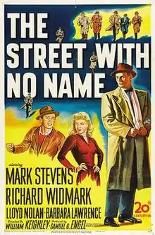 The Street with No Name is a 1948 film noir directed by William Keighley. A follow-up to The House on 92nd Street (1945), it tells the story of an undercover FBI agent, Gene Cordell (Mark Stevens), who infiltrates a deadly crime gang. Cordell's superior, FBI Inspector George A. Briggs (Lloyd Nolan), also appears in The House on 92nd Street. The film, shot in a semidocumentary style, takes place in the Skid Row section of fictional (actually Los Angeles) "Center City."[2]