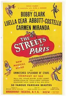 The Streets of Paris is a musical revue featuring Bobby Clark, Luella Gear, Abbott and Costello and Carmen Miranda, debuted on May 29, 1939 in Boston and on June 19, 1939 in New York. Had two hours and-a-half, with the interval. The musical was staged from June 1939 to 10 February 1940, totaling 274 presentations.[1]