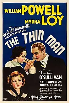 The Thin Man is a 1934 American pre-Code comedy-mystery directed by W. S. Van Dyke and based on the 1934 novel of the same name by Dashiell Hammett. The film stars William Powell and Myrna Loy as Nick and Nora Charles, a leisure-class couple who enjoy copious drinking and flirtatious banter. Nick is a retired private detective who left his very successful career when he married Nora, a wealthy heiress accustomed to high society. Their wire-haired fox terrier Asta was played by canine actor Skippy. In 1997, the film was added to the United States National Film Registry having been deemed "culturally, historically, or aesthetically significant."