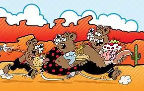 Ma and Pa Bear and their young son Teddy (later called Ted) were three anthropomorphic bears who lived in a setting loosely based on the American Wild West. They were lazy and gluttonous, and lived in a cave upon a hill. Most storylines revolved around their attempts to steal "grub" from the local storekeeper Hank (who often shoots at the Three Bears with his blunderbuss for trying to rob him). There was the occasional appearance by the local sheriff, and their rival bear Grizzly Gus (who had a son called Gus's Grizzly).[12]