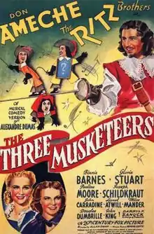 The Three Musketeers is a 1939 musical comedy film adaptation of Alexandre Dumas's 1844 novel The Three Musketeers directed by Alan Dwan and starring Don Ameche as d'Artagnan, with the Ritz Brothers as his cowardly helpers.