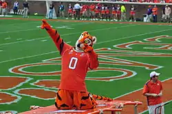 The Tiger is the mascot of the Clemson Tigers, the athletic teams of Clemson University in Clemson, South Carolina. The anthropomorphized tiger is costumed in Acrylic/polyester fur, and in recent years wears a football, basketball, or baseball jersey or a T-shirt.[1] The Tiger has a smaller companion, The Cub, who wears shorts, oversized sneakers, and a jersey numbered 1⁄2.