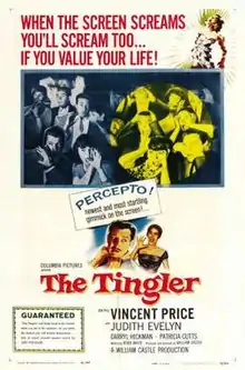 "Percepto!" was a gimmick where Castle attached electrical "buzzers" to the underside of some seats in theaters where The Tingler was screened to provide "tingling" sensations during certain scenes.[12][6] The buzzers were small surplus airplane wing deicing motors left from World War II. The cost of this equipment added $250,000 to the film's budget.[1] It was used predominantly in larger theaters. The prologue claimed some people might not be susceptible to the "tingling" to take account that not all seats were wired.[6]