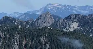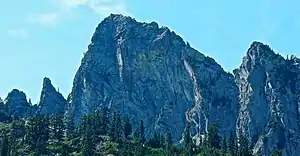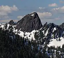 The Tooth is the descriptive name for a 5,604 ft, fin-like, andesite pillar located in King County of Washington state.[2] It is part of the Cascade Range and is within the Alpine Lakes Wilderness. The Tooth is located northwest of Snoqualmie Pass and the Alpental ski area on land managed by Mount Baker-Snoqualmie National Forest. The nearest higher peak is Bryant Peak, 0.44 miles (0.71 km) to the northwest.[1] Originally called Denny Horn and Denny Tooth, The Tooth became the officially recognized name in 1918, with Denny referring to its position on the high ridge between Denny Mountain and Chair Peak. The Tooth is a popular rock climbing destination, even in winter. The easiest route is class 4 scrambling, but solid rock provides technical routes, with the South Face considered a classic 5.4 climb that was first done in 1928 by Anderson and Wunderling.[3]