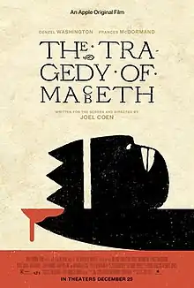 The Tragedy of Macbeth is a 2021 American historical thriller film written and directed by Joel Coen and based on the play Macbeth by William Shakespeare. It is the first film directed by one of the Coen brothers without the other's involvement. The film stars Denzel Washington, Frances McDormand (who also produced the film), Bertie Carvel, Alex Hassell, Corey Hawkins, Harry Melling, Kathryn Hunter, and Brendan Gleeson.[3]