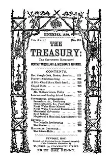 The Treasury was a Welsh 19th century periodical first produced, for the Calvinistic Methodists, by D. Williams in Llanelli in 1864. Monthly editions were produced, edited by minister Joseph Evans (1832-1909). Its articles highlighted religious subjects and denominational news. The journal has historical value as a record of the Evangelical Revival in Wales in the late 18th and early 19th century. [1][2]