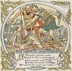 Most illustrators of the fables pictured ancient battle scenes, but Thomas Bewick updated it by dressing the trumpeter in the uniform of his times.[6] Brooke Boothby also modernised the fable in his poetic version, which ends with the line "The poor Trumpeter was shot".[7] William Somervile similarly chooses a contemporary setting, making his “Captive Trumpeter” the French prisoner of “a party of hussars” and condemning him to an ignominious death.