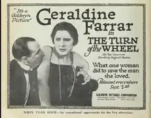 The Turn of the Wheel is a lost 1918 American silent romantic drama film produced and distributed by Goldwyn Pictures. Reginald Barker directed and Geraldine Farrar starred.[1][2]