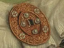 The painting technique reflects Matsys himself and is similar to his other work. The paint is worked in many places wet-in-wet and has been dragged and feathered. Matsys popularly used feathering to soften and blend transitions of tone.[8] The hair near the Duchess's right ear and the embroidery on her right cuff are rendered in sgraffito, a technique done by scratching through a layer of wet paint to show the underlying layers.[9] Matsys achieved the uneven appearance of her flesh by layering the basic pink with red and white dots in sporadic dashes and blotches. Matsys displays finer attention to detail through his brushwork when looking at the ornamental brooch. In the brooch are at least five shades of brown, orange, pink and yellow to achieve its golden hue.[7]