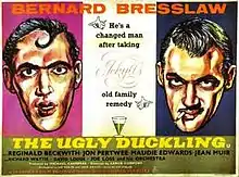 The Ugly Duckling is a 1959 British black science fiction comedy film, directed by Lance Comfort and starring Bernard Bresslaw, Jon Pertwee and Reginald Beckwith.[2] The film is a comic adaptation of Robert Louis Stevenson's 1886 Dr. Jekyll and Mr. Hyde storyline and the opening credits include "with ideas stolen from Robert Louis Stevenson". The film has no connection to the Hans Christian Andersen story.[3] The tagline on posters was "He's a changed man after taking Jekyll's family remedy."[4]