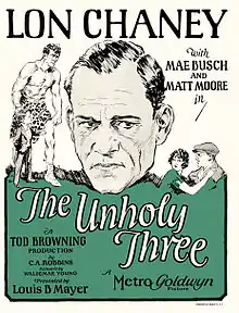 The Unholy Three is a 1925 American silent crime melodrama film involving a trio of circus conmen, directed by Tod Browning and starring Lon Chaney. The supporting cast features Mae Busch, Matt Moore, Victor McLaglen, and Harry Earles. The Unholy Three marks the establishment of the notable artistic alliance between director Browning and actor Chaney that would deliver eight outstanding films to M-G-M studios during the late silent film era.[2][3][4]