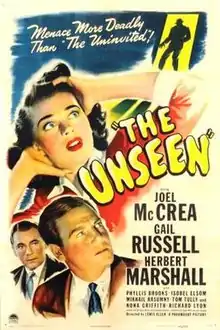 The Unseen is a 1945 American mystery film directed by Lewis Allen and starring Joel McCrea. It's based on the 1942 novel Midnight House (US title: Her Heart in Her Throat) by Ethel Lina White.