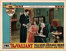 The Valiant is a 1929 American drama film released by Fox Film Corporation in the Fox Movietone sound-on-film system on May 19, 1929.[1] It is produced and directed by William K. Howard (his first sound film) and stars Paul Muni (in his film debut), Marguerite Churchill (in her feature film debut), and John Mack Brown. Although described by at least one source[2] as a silent film containing talking sequences, synchronized music, and sound effects, The Valiant has continuous dialogue and is a full "talkie" made without a corresponding silent version.[3]