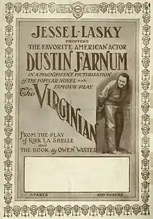 The Virginian is a 1914 American silent Western film based on the 1902 novel The Virginian by Owen Wister. The film was adapted from the successful 1903–04 theatre play The Virginian, on which Wister had collaborated with playwright Kirke La Shelle. The Virginian starred Dustin Farnum in the title role, a role he reprised from the original play. It was directed by Cecil B. DeMille.