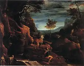 The Vision of Saint Eustace is a painting by Annibale Carracci, showing saint Eustace and his vision of a crucifix between the horns of a stag whilst out hunting. The saint is set in one of the first landscapes by either of the Carracci brothers, showing how he was influenced by Venetian landscape painting until about 1598 after a stay in the city in 1587 and 1588.[1] Specific influences include Titian's Penitent Saint Jerome (Louvre) and the naturalism of Jacopo Bassano.[1] Critics argue the composition is based on two prints by Cornelis Cort, a Flemish printer - Penitent St Jerome and The Vision of Saint Eustace. These prints were in turn based on ideas by the Lombard painter Girolamo Muziano, who was also influenced by Venetian models.[2] The dogs and some other details are drawn from Saint Eustace, an engraving by Albrecht Dürer of the same subject.[2]