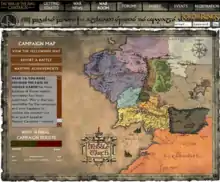 The campaign system was designed by Mathew Ward.[1] Based on the Lord of the Rings Strategy Battle Game, the only two sides were "Good" and "Evil", who contested thirteen regions set in Middle-earth: Eriador, Angmar, Iron Hills, Mirkwood, Misty Mountains, Dunland & Isengard, Lothlórien & Fangorn, Rohan, Rhûn, Gondor, Mordor, Harad and the Fellowship Path.[2] Each day, registered participants could submit the results of a tabletop battle-game played using special "regional rules" for any one of these regions. The website's "War Room" was updated each weekday at 10:00 GMT, and showed where each side was leading. At the end of each week, the wins would be tallied and "Victory Points" would be awarded to each side to determine who was winning over all.