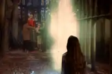 The first official theatrical ending, which was shown in the film's brief 1980 screening in New York City (see Release history)[5] featured only part of the original ending, eliminating the "other world" sequence and replacing it with Helen's interrogation of Tom, Mary, and John at the chapel, after Jan disappears during their re-enactment of the séance. It did, however, include the appearance of the alien creature as it picks up Jan and disappears into thin air.[20] While Helen is questioning everyone in the chapel, Jan re-appears, and emerges from a beam of light, hand-in-hand with Karen. The girls return to the house, where Mrs. Aylwood and Karen are re-united in the front yard, and Jan discusses the watcher with Ellie.[20] This ending forced the film to rely on Jan's brief, cryptic explanation to provide closure. This conclusion to The Watcher in the Woods was nearly unintelligible as a result, thus giving the film the reputation of not having an ending. It also omitted Mrs. Aylwood's condemnation of recreating the séance on the basis that it was witchcraft.[20]