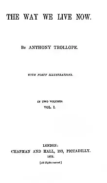 Trollope began writing The Way We Live Now on May 1, 1873, five months after returning from an extended trip to Australia and New Zealand.[1] He paused work in order to write the shorter novel Harry Heathcote of Gangoil, a Christmas novel he had already promised his publisher, but he resumed work on The Way We Live Now by July. It was completed on 22 December 1873, and the first of twenty monthly installments was published by Chapman & Hall beginning in February 1874. Chapman & Hall had purchased the rights for both the serialisation and the full novel for £3,000. However, the serialisation sold badly, prompting the publisher to release the full novel in a two volume form in June 1875, four months before the serialisation was set to finish.[2] The two volume first editions were large octavos occupied by the unsold pages from the serialised printings.[3]