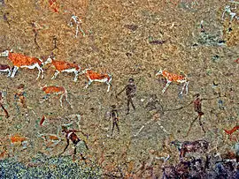 The painting has long been an archaeological dilemma, and several different hypotheses have been put forth on its origins, authorship and dating. It is now usually accepted to be a bushmen painting,[1] dating back at least 2000 years ago.[2]