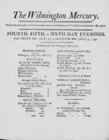The Mercury was founded by W. C. Smyth in September 1798 as a response to the outbreak of yellow fever going through Wilmington, Philadelphia, and New York City.[2] It was published daily and given without charge. All issues included the names of those who had died in the last 24 hours, as well as encouraged donations to the Board of Health.[3] Though it first had just listed deaths in Wilmington, by October 4 it listed Philadelphia and New York City too. It also listed the names of people who contributed to the Board of Health as well as gave important advice about dealing with the outbreak. When the epidemic subsided in November, The Mercury closed.[2] Its last issue was published on October 30.[4]