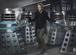 Several different designs of the Daleks from across the series' history reappear in the episode, alongside their creator, Davros, and their home planet, Skaro.[2]