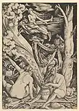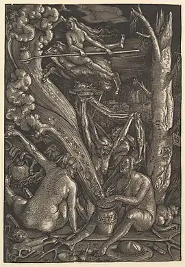 The Witches (formerly titled The Witches' Sabbath) is a chiaroscuro woodcut by German Renaissance artist Hans Baldung. This woodcut depicts witches preparing to travel to a Witches' Sabbath by using flying ointment. This is the first woodcut produced by Baldung after leaving the studio of his mentor, Albrecht Dürer, and one of the first Renaissance images to depict both witches that fly and a Witches' Sabbath.