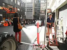 On October 8, 2012, production returned to Sydney with filming on Erskine Street near Cockle Bay.[73] The following week, the film shot in Parramatta, which doubled as a Japanese city.[74] Also in October, Mangold revealed that the film follows the events of X-Men: The Last Stand, saying, "Where this film sits in the universe of the films is after them all. Jean Grey is gone, most of the X-Men are disbanded or gone, so there's a tremendous sense of isolation for [Wolverine]."[75] Mangold later stated that in the fight scenes, "there's an urgency and a kind of intensity and hand to hand physicality that I hope is a little different than everything else out there."[15] On October 25, 2012 production relocated to Sydney Olympic Park in western Sydney.[76] The set was made into a Japanese village draped in snow with filming beginning on November 1, 2012.[77] On November 10, 2012, filming took place on a back street in Surry Hills. The set, constructed on Brisbane St., was transformed to look like a Japanese street with Japanese signage and vehicles scattered throughout.[78] Principal photography concluded on November 21, 2012.[79]